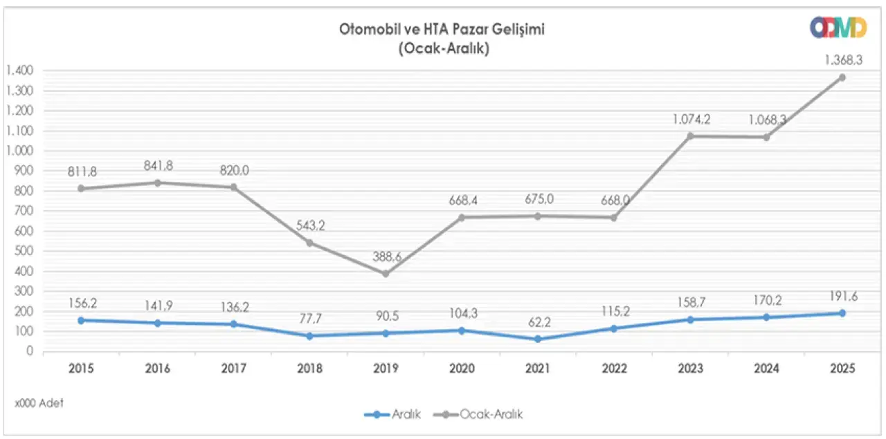 2025 yılı Ocak-Aralık döneminde Türkiye'deki otomobil ve hafif ticari araç pazarı, bir önceki yıla kıyasla önemli bir artış göstererek toplamda 1.368.400 araç satışına ulaştı. Bu artış, otomobil satışlarında yüzde 10,62 ve hafif ticari araç satışlarında ise yüzde 9,97 gibi rakamlarla kendini gösterdi. Otomotiv Distribütörleri ve Mobilite Derneği (ODMD) verilerine göre, toplam satışların 1.084.496 adedi otomobil, 283.904 adedi ise hafif ticari araçlardan oluştu.