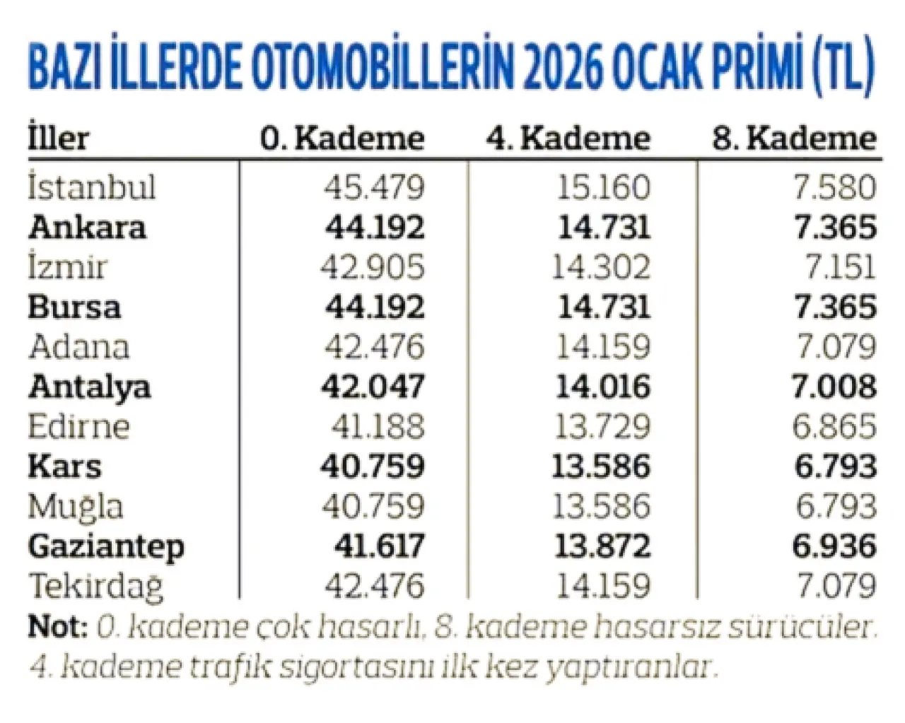 Otomobiller için en yüksek prim 45 bin 479 TL oldu. Bu tutarı İstanbul’da, 0. kademede yer alan ve çok hasarlı geçmişe sahip sürücüler ödeyecek. En düşük prim ise 6 bin 973 TL olarak açıklandı. Bu rakamı ise Aydın, Burdur, Çanakkale, Hakkari, Hatay, Isparta, Kars, Kastamonu, Mardin ve Muğla gibi illerde yaşayan, 8. kademede hasarsız sürücüler ödeyecek.