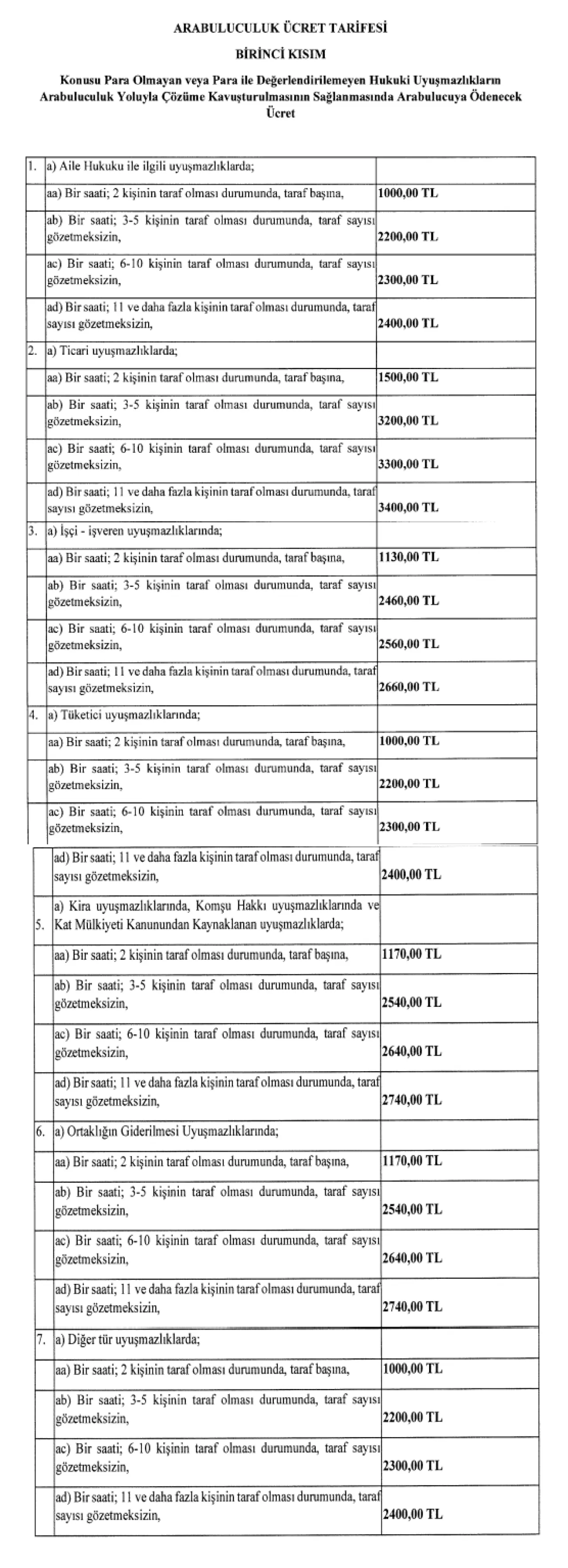 Resmi Gazete' de yayımlanan tebliğe göre, arabuluculuk ücretleri çeşitli durumlara göre değişiklik göstermektedir. Örneğin, aile hukuku gibi konularda iki kişinin taraf olduğu uyuşmazlıklarda, her bir taraf için saat ücreti 1.000 lira olarak belirlenmiştir. Taraf sayısı üç ila beş olduğunda saatlik ücret 2.200 lira, altı ila on taraf olduğunda 2.300 lira, on bir ve daha fazla kişi olduğunda ise 2.400 lira olacaktır. Ticari uyuşmazlıklar için belirlenen oranlar ise daha yüksektir. İki taraflı işlemlerde saat ücreti 1.500 lira, üç ila beş taraf için 3.200 lira, altı ila on için 3.300 lira, on bir ve üzeri için 3.400 lira olarak belirlenmiştir.