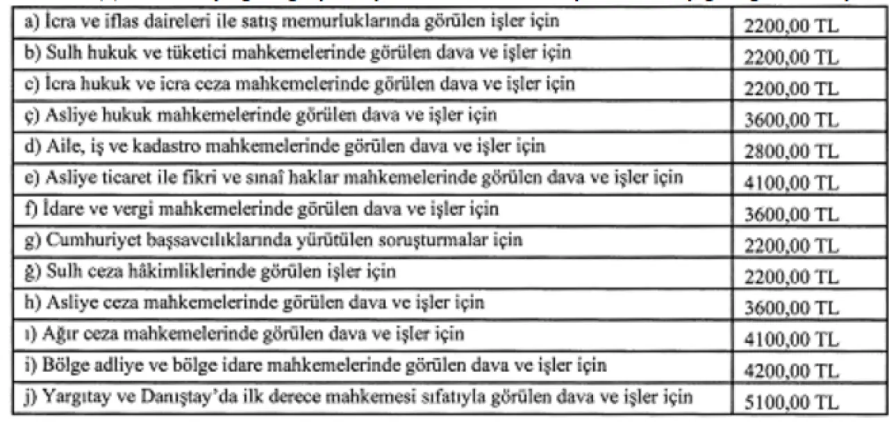 2026 yılına yönelik bilirkişi asgari ücret tarifesi belirlendi ve Resmi Gazete'de yayımlandı. Bu tarifeye göre, icra ve iflas mahkemelerinde görevli satış memurluklarda gerçekleştirilen işler ile sulh hukuk ve tüketici mahkemelerinde görülen davalar için belirlenen tarifeye göre 2.200 TL ücret ödenecek.
