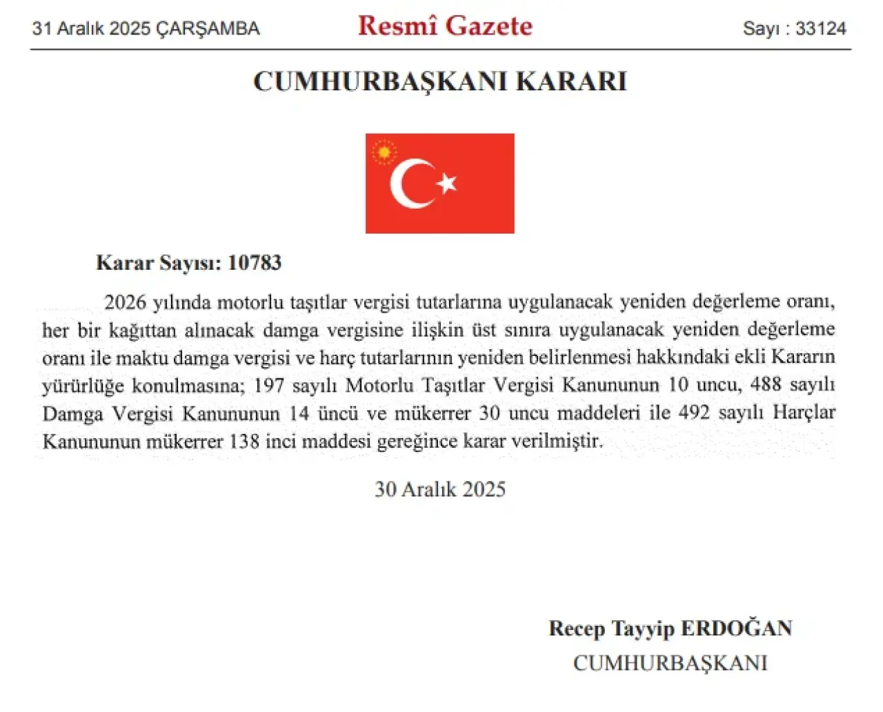 Hazine ve Maliye Bakanlığı 2026 yılı damga vergisi tutarlarını kamuoyuna duyurdu. Resmî Gazete’de yayımlanan karar doğrultusunda, damga vergisi kalemlerine %18,95 oranında bir zam gerçekleştirildi. Bu artış, mükelleflerin hem beyanname işlemlerini hem de resmi dairelere ve bankalara sunulan belgeleri doğrudan etkiliyor.