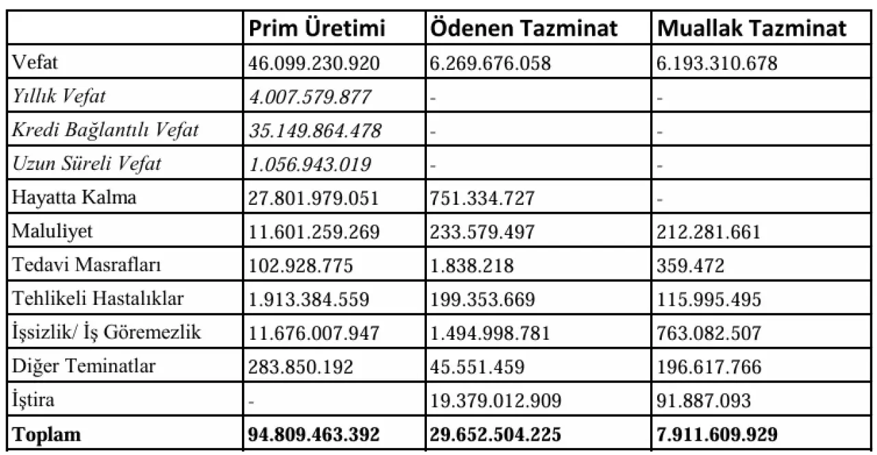 Hayat sigortası şirketleri, 2025 yılı içerisinde kredi bağlantılı olarak 18.2 milyar TL teminat sunmuştur. Bu teminatların yaklaşık 9 milyar TL'si yıllık vefat poliçelerinden, diğer 9 milyar TL'si ise uzun süreli vefat teminatlarından oluşmaktadır. Böylece toplam hayat sigortası priminin %40'ının, verdikleri kredilerle bağlantılı hayat sigortalarından elde edildiği görülmektedir.