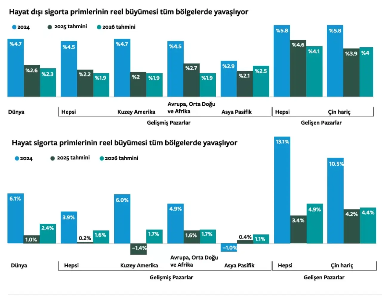 Rapora göre, küresel ölçekte prim büyümesinin, artan rekabet, fiyat artış hızının zayıflaması ve potansiyel tarife artışları gibi yükselen maliyet baskıları nedeniyle 2026’ya kadar gerilemesi bekleniyor. Yükselen piyasalarda ise, primlerin yarısını oluşturan Çin’deki ekonomik yavaşlama sonucu 2025 ve 2026 yıllarında bir düşüş öngörülüyor.
