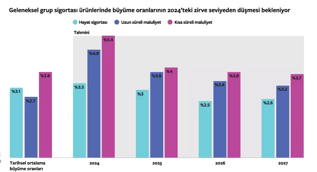 Rapora göre 2024 yılında zirveye ulaşmasının ardından, grup sigortası segmentindeki büyümenin önümüzdeki birkaç yıl boyunca yavaşlaması bekleniyor. Segmentin büyümesini etkileyen faktörler arasında sıkılaşması beklenen istihdam ve ücret trendleri ile geleneksel çalışan fayda programlarına katılımı baskılayabilecek artan sağlık hizmeti maliyetleri yer alıyor. Segmentin büyümesini şekillendiren faktörler arasında, giderek sıkılaşan iş gücü ve ücret trendlerinin yanı sıra, çalışan fayda programlarına katılım üzerinde baskı oluşturabilecek artan sağlık maliyetleri öne çıkıyor. Bu dışsal zorluklara rağmen, sektörde hâlâ büyüme fırsatları bulunuyor. Yardımcı (yan) çalışan faydalarına yönelik artan talep, sigortacılar açısından önemli bir genişleme alanı yaratıyor. Birçok sigorta şirketi; belirli sektörlere, demografik gruplara veya küçük işletmeler gibi yeni segmentlere özel çözümler sunarak bu eğilimden faydalanmaya hazırlanıyor.