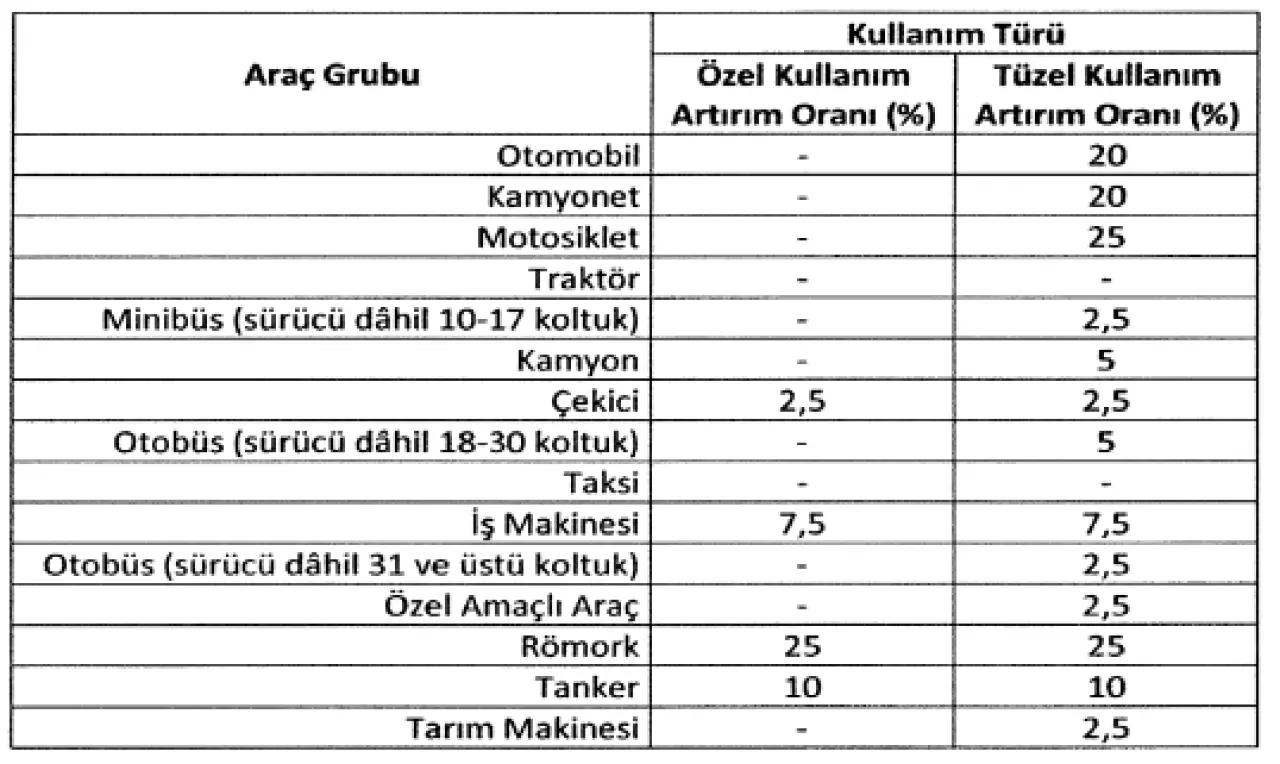 ARAÇ GRUBU BAZINDA UYGULANACAK ARTIRIM ORANLARI
