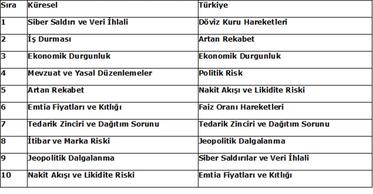 Aon’un gerçekleştirdiği bu araştırma, Türkiye de dâhil olmak üzere 63 ülkeden 2.941 iş liderinin görüşlerini topladı. Araştırma sonucunda dünya genelinde siber saldırı ve veri ihlali, iş dünyası için en büyük tehdit olarak öne çıkıyor. Bunların ardından iş durması ve ekonomik durgunluk gibi riskler geliyor. Türkiye için ise döviz kuru hareketleri, iş dünyasında en çok kaygı yaratan unsur olarak ilk sırayı alıyor. İkinci sırada artan rekabet dikkat çekerken, ekonomik durgunluk ise üçüncü sırada yer almakta. Bu durum, Türkiye'nin ekonomik dinamikleri göz önünde bulundurulduğunda, iş ortamını ne kadar etkileyen bir durum olduğunu gösteriyor.